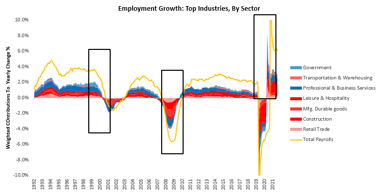 Of particular note is that labor markets are currently highly exposed to cyclicality, while aggregate wages are less. This dynamic is because employment growth is currently being driven by areas of the economy that are cyclically sensitive. At the same time, nominal aggregate wages are concentrated in more resilient areas of the economy. Below, we show the top contributors to labor market growth and colour the cyclically sensitive areas in shades of red and resilient areas in shades of blue: