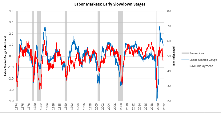 Of particular note is the widening of our estimates of the commodity risk premium. As markets move to price slowing inflationary pressures & liquidity conditions, the premium required for investing in commodities continues to rise. We saw a similar dynamic during the unwind of the commodity bull market in 2008. We are witnessing the first leg of liquidity tightening, i.e., primarily from higher discounting of cash flows and some degree of fiscal tightness. As the Treasury moves to increase its cash balance further and Quantitative Tightening picks up further pace, the effects in both financial markets and the real economy are likely to be acute. This tightening has significant ramifications for the state of the labor market. Currently, we are seeing a robust labor market. However, early indications of cyclical weakness are beginning to shine through. We show our gauge of this below: