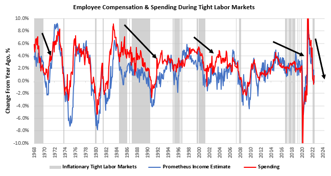 Therefore, we continue to see the tight labor markets as a self-limiting factor, i.e., robust nominal growth driven by inflation tends to cause its own downfall. Below we show these periods of “inflationary-tight labor markets” tend to result in declining incomes & spending on a real basis: