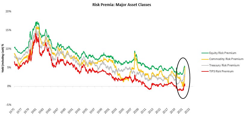Last week, risk assets struggled, with the dollar showing strength while commodities sold off. As liquidity from the Federal Reserve and the Treasury tighten, we continue to witness an elevation in risk premia. We offer our estimates of major asset class risk premia below: