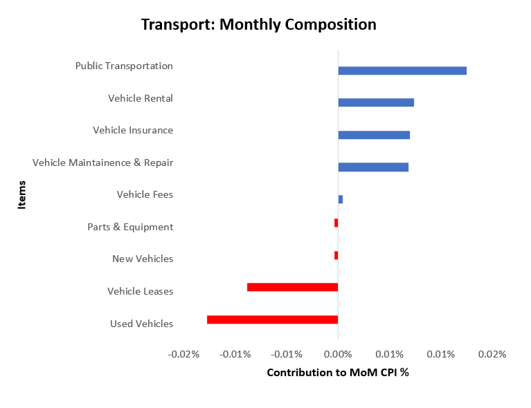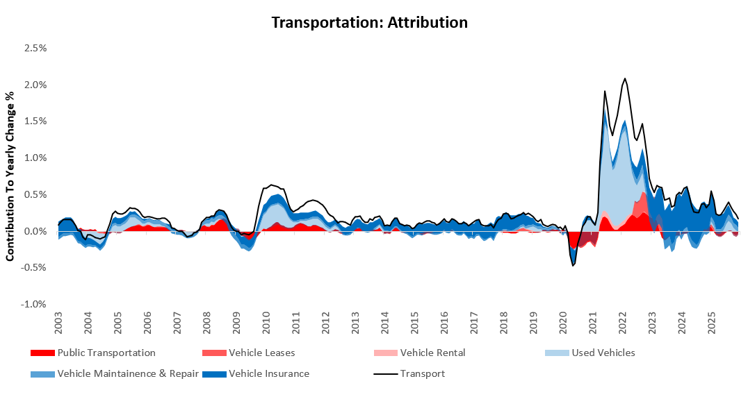 For further perspective, we also show the evolution of transportation inflation over the last year, with the strongest contributors in shades of blue (Vehicle Insurance, Vehicle Maintenance & Repair, Used Vehicles) and the weakest in shades of red (Public Transportation, Vehicle Leases, Vehicle Rental):