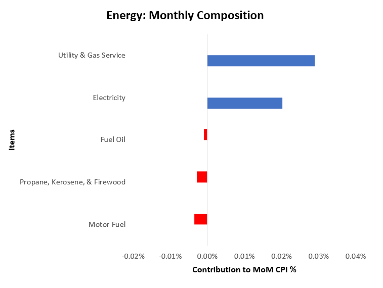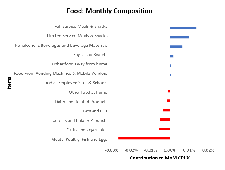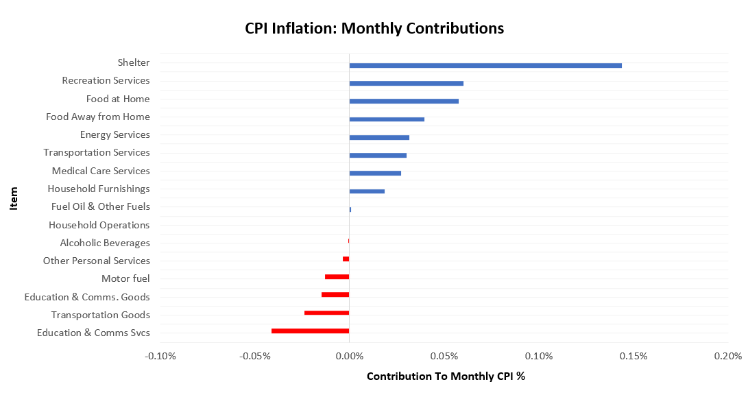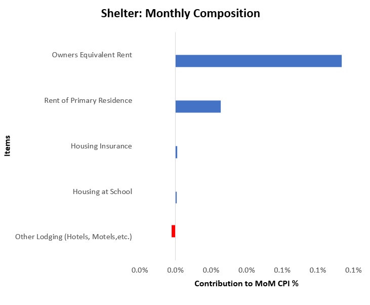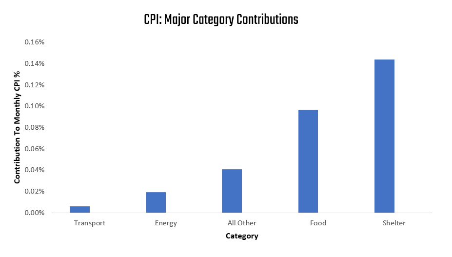 The primary drivers of CPI inflation are food, energy, transport, and Shelter. These components have contributed 0.1% (Food), 0.02% (Energy), 0.01% (Transport), and 0.14% (Shelter), respectively. We display these contributions to the 0.31% change in CPI below: