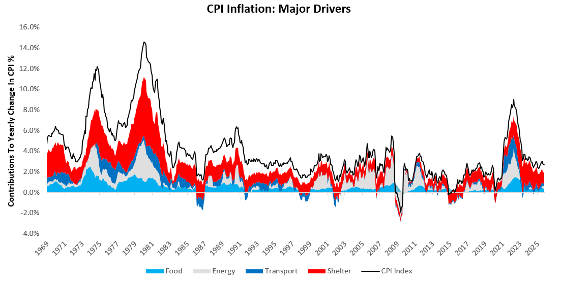 For further perspective, we show that these areas have accounted for the majority of the variation in inflation, both economically and statistically. Over the last year, food, energy, transport, and housing have contributed 0.41% (Food), 0.15% (Energy), 0.18% (Transport), and 1.11% (Shelter), respectively, to the change in inflation. We display these principal drivers of inflation over time below: