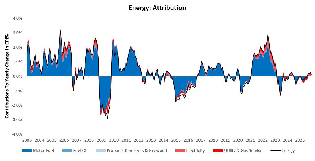 Next, we turn to energy. The most recent data showed energy inflation was largely negative, with Utility & Gas Service showing the greatest relative strength and Motor Fuel the most significant weakness.