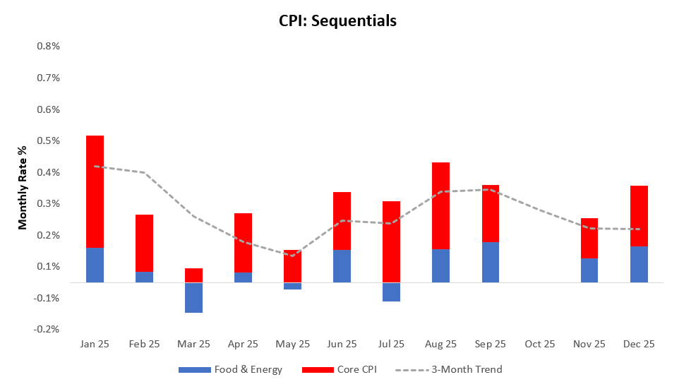 In December, headline CPI came in at 0.31% surprising consensus expectations of 0.3%. Core CPI contributed 0.19% to this print, with food & energy contributing the remaining 0.12%. This print drove a deceleration in the three-month trend. Below, we display the sequential evolution of the data: