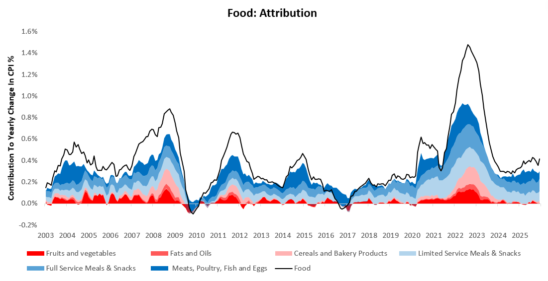 We now zoom in on our major categories: food, energy, transport, and Shelter. We begin with food. The most recent data showed food inflation was somewhat mixed, with Full Service Meals & Snacks showing the most relative strength and Meats, Poultry, Fish, and Eggs showing the most weakness.
