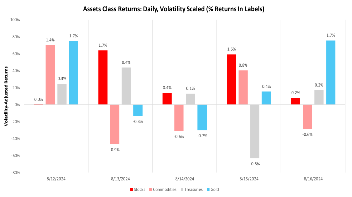 Let's dive into the data driving our assessment before moving on to positioning. Over the last week, macro market rose in aggregate. Equities and gold rose significantly, bonds were modestly positive, and commodities fell significantly.