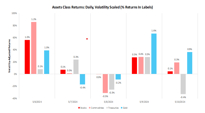 Let's dive into the data driving our assessment before moving on to positioning. Over the last week macro asset markets rose in aggregate, with the gains skewed towards stocks and commodities. Gold performed well, while bonds once again lagged.