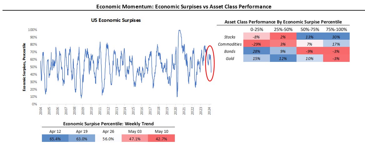 Economic data momentum fell further this week, despite a week light on macro data. This is a significant move down if sustained, as it has typically marked changes in the distribution of asset returns, with gains shifting from pro-growth assets (stocks and commodities) to anti-growth assets (bonds and gold). The odds of fundamental regime change are rising.