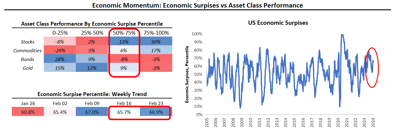 As we can see above, equities posted the strongest returns, though gold offered the smoothest path for returns. This pattern of performance is continuous with liquidity-supporting assets across dimensions, though treasuries continue to face headwinds. This pricing came as home sales and jobs data continued to push our economic data momentum higher. Below, we show how economic data momentum expanded over the last week: