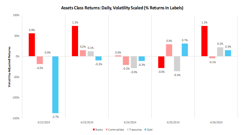 Let's dive into the data driving our assessment before moving on to positioning. Over the last week macro asset markets rose in aggregate, however, the distribution of gains was shifted to disinflationary assets, i.e. stocks and bonds. Golds and commodities saw a weaker path of returns.