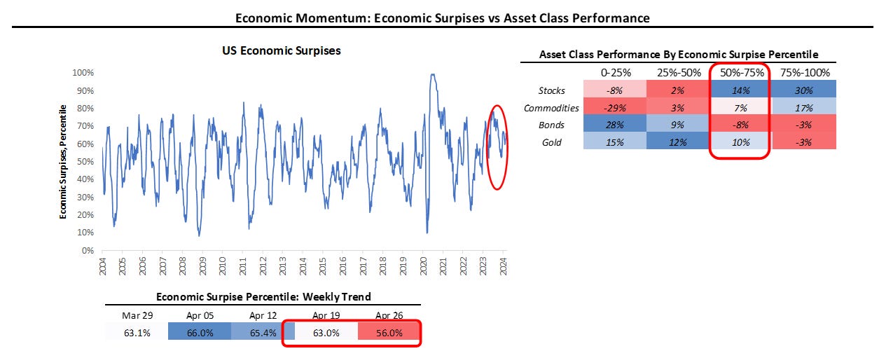 Economic data momentum fell this week, primarily driven by weak GDP data and PMIs. Under the surface, durable goods orders, housing, and labour data held up economic data momentum.
