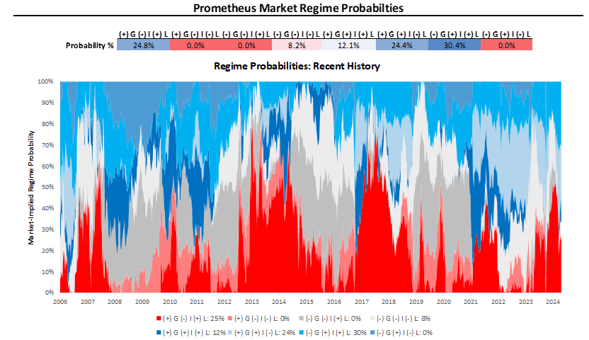 Markets have now moved to rising growth, inflation, and liquidity. This combination of market regimes probabilities is supportive of stocks and commodities, but much less so for bonds.