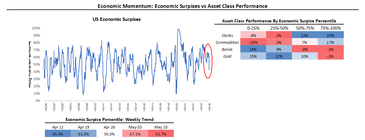 Economic data momentum fell further this week, with cyclical data disappointing expectations. This is the third consecutive week of deteriorating data momentum, which is crucial to watch as it has typically marked changes in the distribution of asset returns, with gains shifting from pro-growth assets (stocks and commodities) to anti-growth assets (bonds and gold). The odds of fundamental regime change are rising.