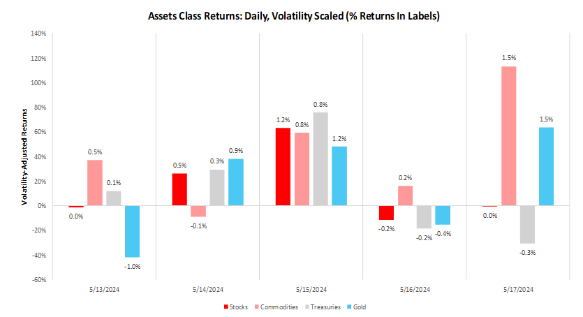Let's dive into the data driving our assessment before moving on to positioning. Over the last week macro asset markets rose in aggregate, with the gains skewed towards commodities and gold. Bonds also saw gains, breaking their recently negative correlation to commodities.