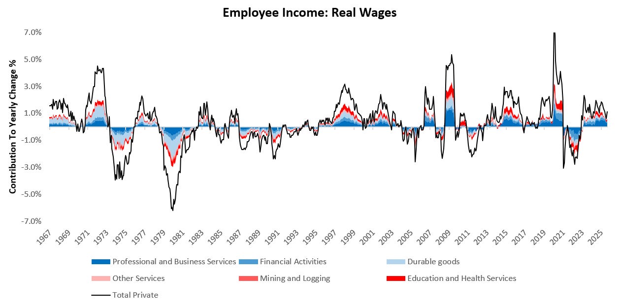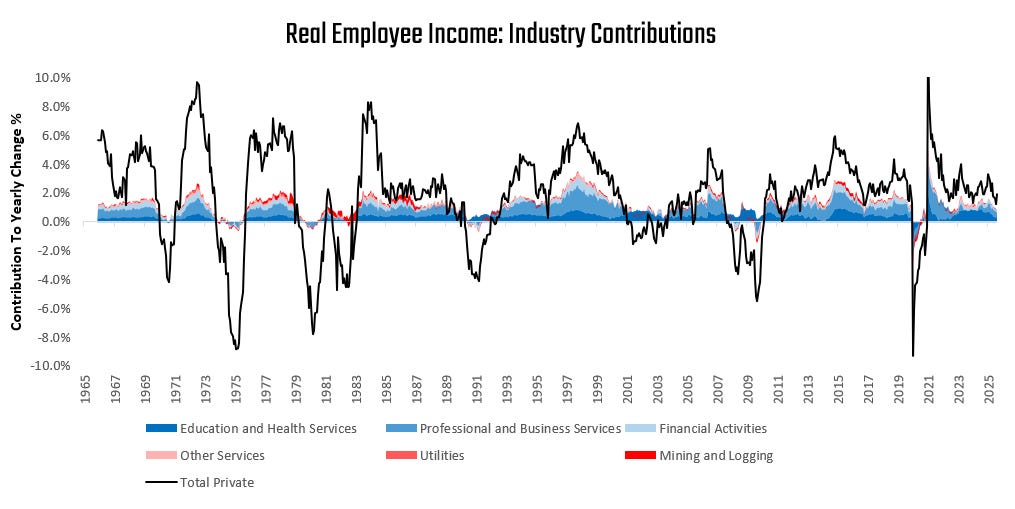 To better understand these dynamics, we turn to real employee income, which over the last year has largely been positive, with Education and Health Services, Professional and Business Services, and Financial Activities contributing strength (shown in shades of blue). On the other hand, Mining and Logging, Utilities, and Other Services are the weakest areas of income (shown in shades of red):