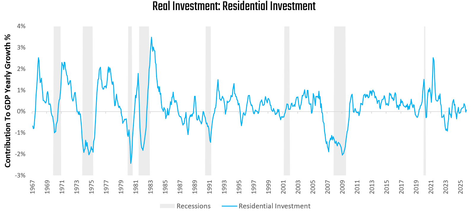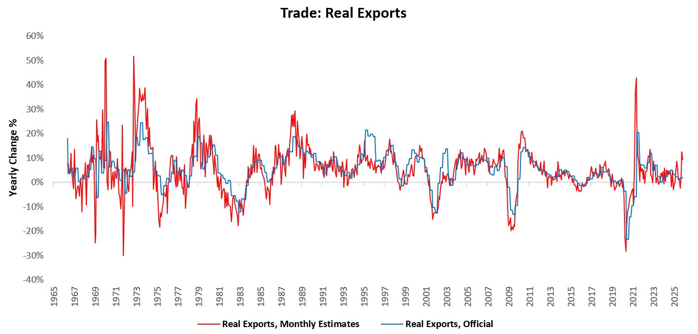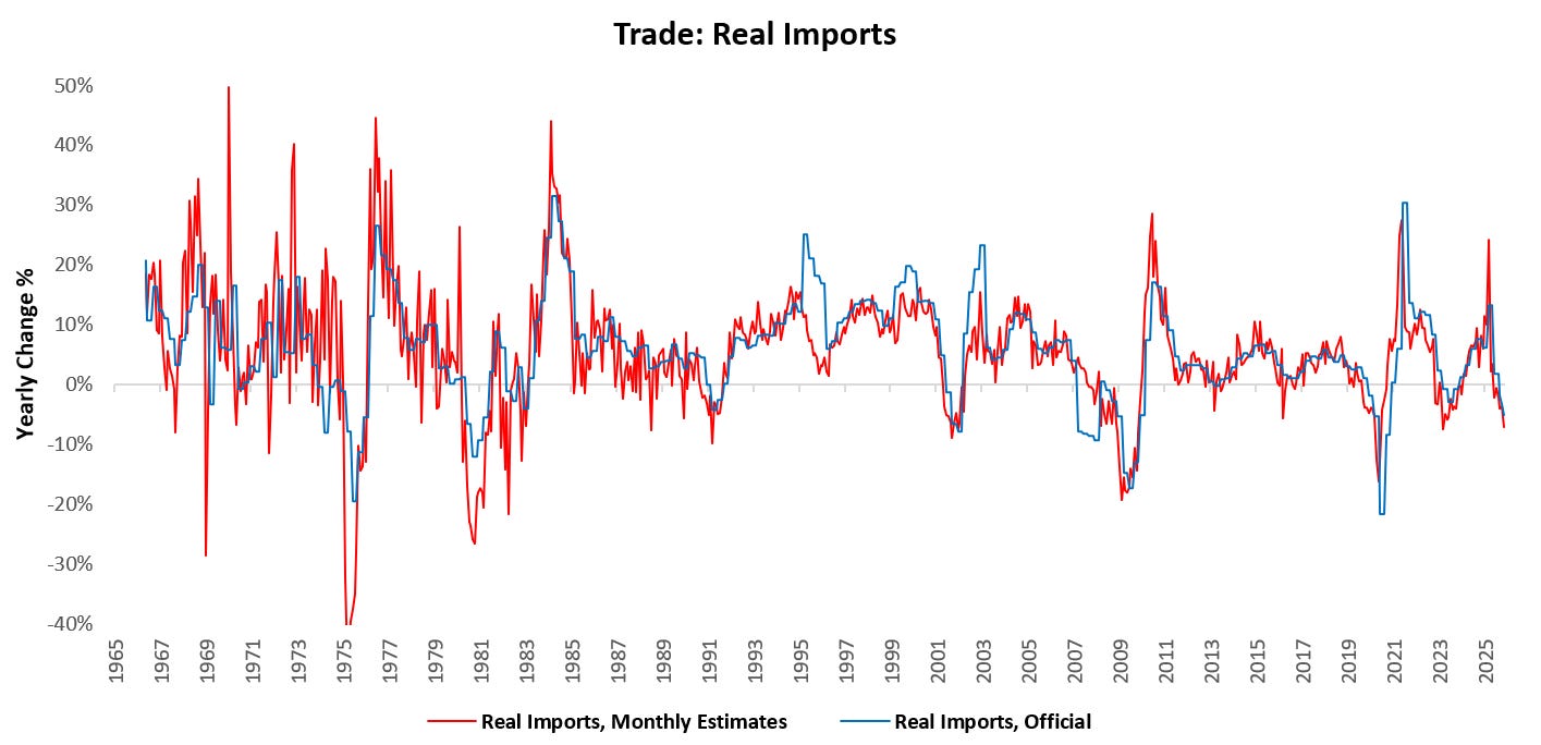 Much like government spending, trade is rarely the driver of shifts in the US macroeconomic cycle, as the US is largely a domestically oriented economy. This year, however, we have seen significant volatility in trade data, mostly induced by tariff policy expectations. Regardless of the concerns, trade has been a minimal driver of trend rates of growth.