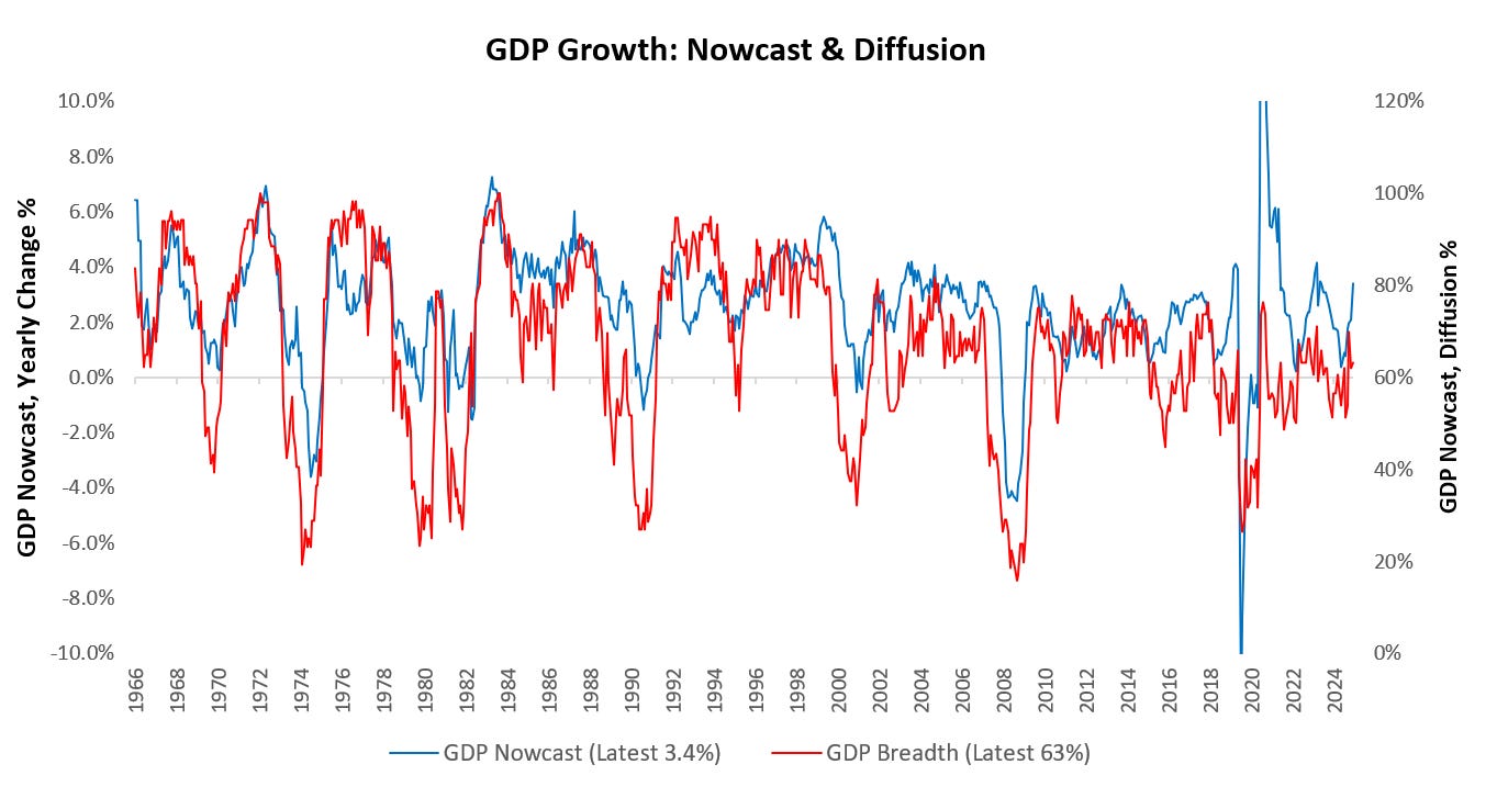 Next, we zoom out to offer what the mosaic of economic data says about the pervasiveness of GDP growth. Our GDP Nowcast uses 75 measures of real growth conditions to provide timely insights into the economy. We share both the current level of the nowcast in blue and a diffusion index of the underlying components in red. Currently, 63% of subcomponents are rising, consistent with an expansion: