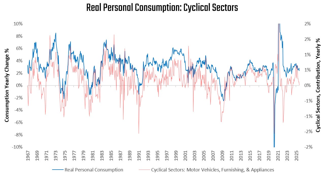 Thus, scanning through the flow of income to consumer spending, we see positive income conditions flowing through to consumer spending. However, the mix of income and spending strength remains skewed to non-cyclical sectors. Furthermore, the underlying employment trend driving current income growth looks concerning, and without a meaningful shift, it will drag on overall economic activity. Overall, consumer spending remains healthy, but cannot continue to accelerate without a meaningful change to employment trends.