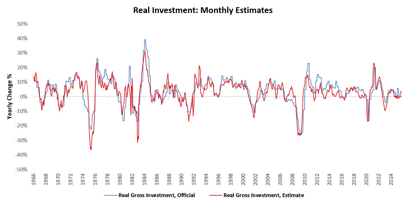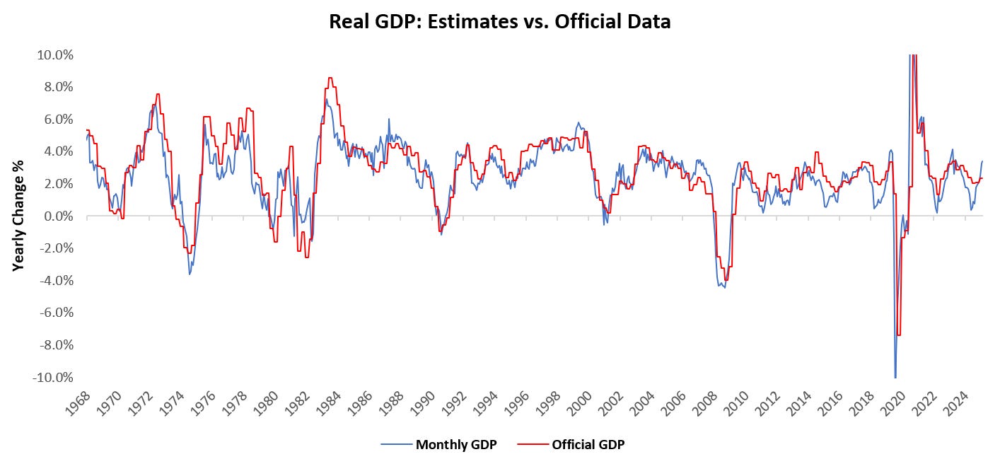 Let’s dive into the data driving this assessment. For the latest data through November, our systems place Real GDP growth at 3.37% versus one year prior. Below, we show our monthly estimates of Real GDP relative to the official data: