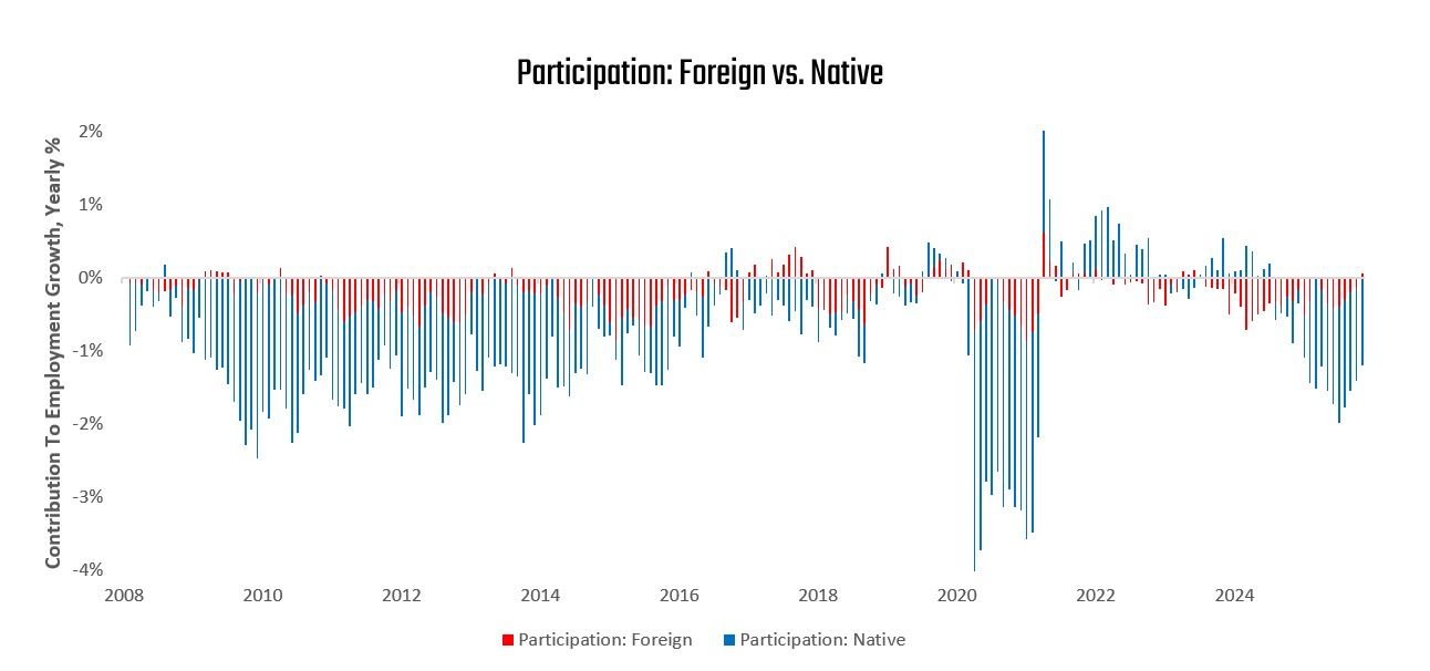 This weakness in employment is coming from a recomposition of the labor force to favour domestic workers over foreign, with reduced labor participation rates: