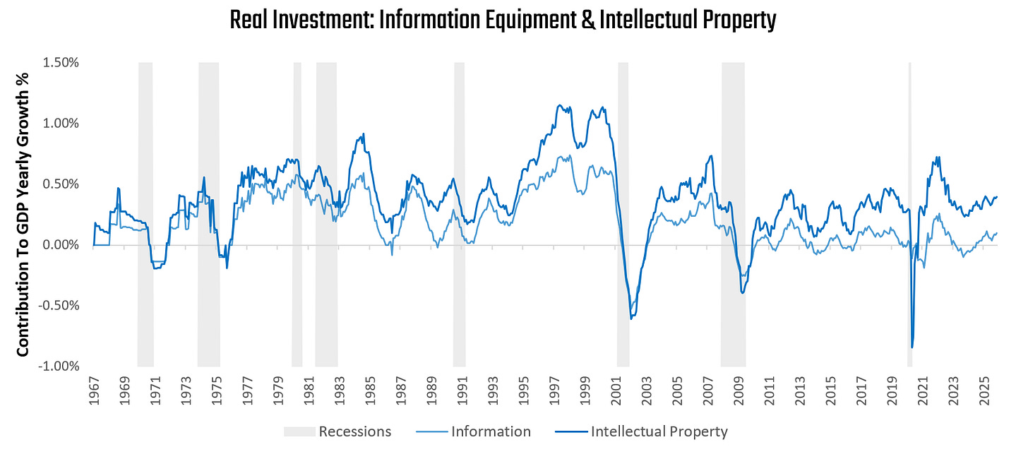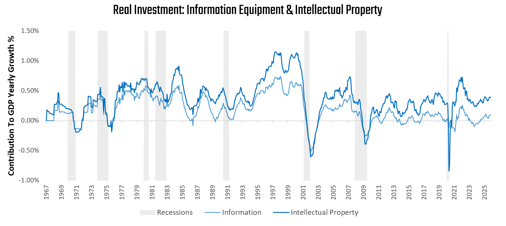 We see these dynamics well-reflected in equity markets, with traditional real-economy businesses lagging meaningfully behind technology firms. Given that much of this spending was financed by excess cash and continues to be, this dynamic can continue a while longer. However, as non-technology businesses become more stressed and technology companies' excess cash balances decline, this effect will likely diminish over time. Technology investment has driven almost all of the gains in business investment, but it cannot continue indefinitely.