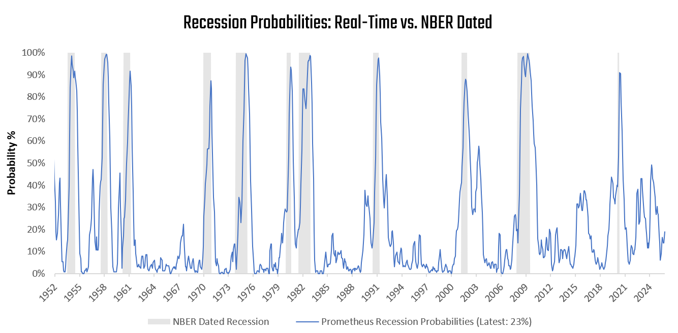 To further assess whether GDP conditions are consistent with recessionary pressures, we aggregate macroeconomic indicators, in line with the NBER's recession classification methodology, into a recession probability monitor. This gauge gives us a real-time understanding of developing recessionary pressures. Currently, recession probabilities are at 23%: