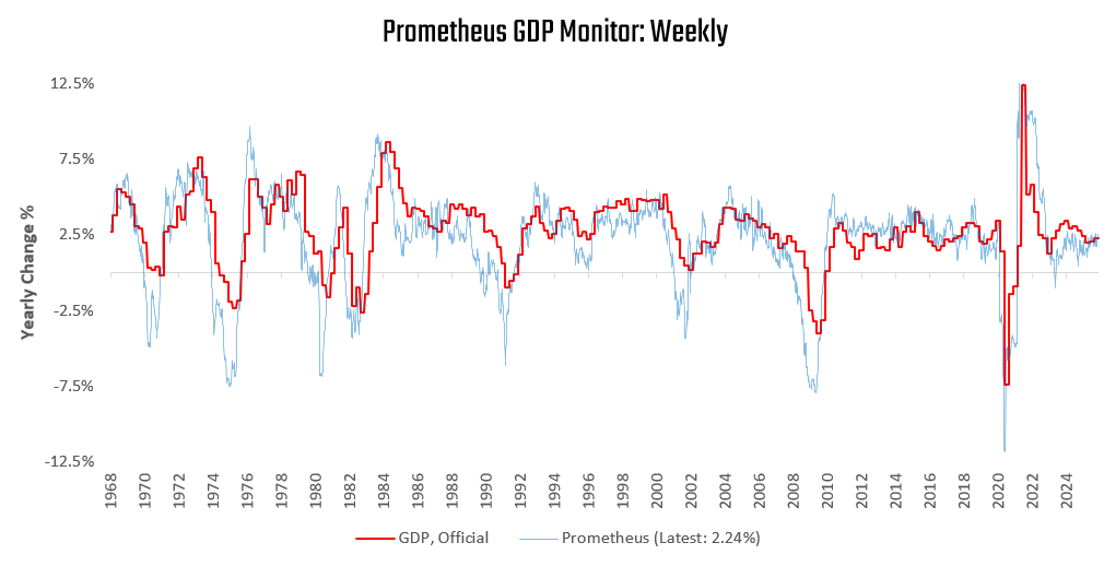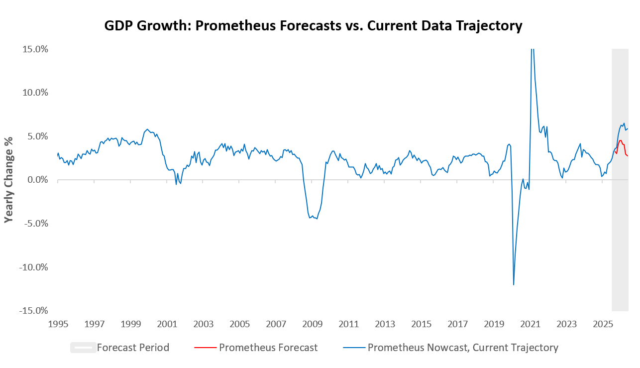 Below, we visualize the prospective paths of real GDP growth over the next twelve months using our data trajectory monitor. We share two processes. First, we extrapolate the current trend in the data to visualize the prospective trajectory of GDP based on the current trend. Additionally, we share our forward-looking estimates for real GDP growth based on our proprietary process: