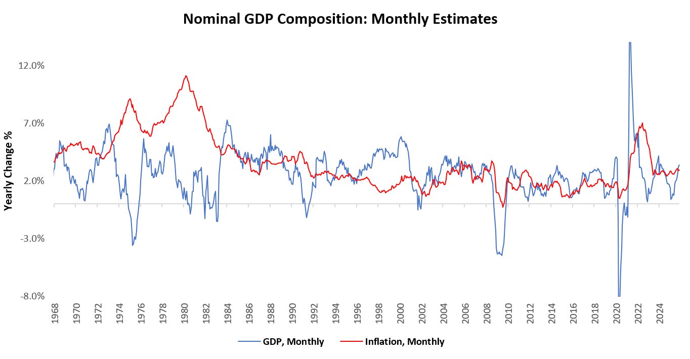 Additionally, we show the composition of the monthly estimates of nominal GDP, broken into real GDP growth and inflation. Our latest estimates place nominal GDP at 6.29% versus one year prior, with real GDP growth of 3.37% and inflation of 2.92%: