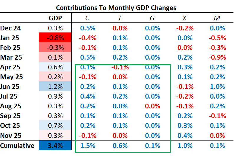 In November, GDP came in at 0.29% versus the prior month. Below, we show the weighted contributions to the most recent one-month change in real GDP, along with the recent history of month-on-month GDP. Additionally, we show the contribution by sector to monthly GDP in the table below: